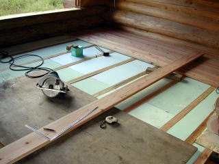 床は、27ミリの杉板を、溝切りカッターで加工して